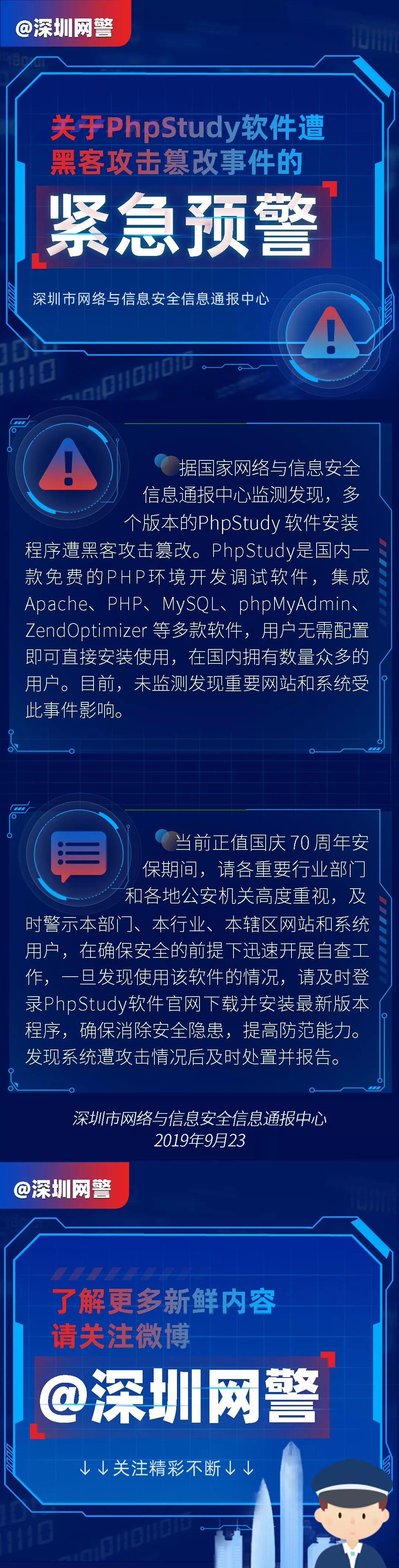見圳客戶端·深圳新聞網(wǎng)2019年9月25日訊 據(jù)國家網(wǎng)絡(luò)與信息安全信息通報(bào)中心監(jiān)測發(fā)現(xiàn),多個(gè)版本的PhpStudy軟件安裝程序遭黑客攻擊篡改。目前,未監(jiān)測發(fā)現(xiàn)重要網(wǎng)站和系統(tǒng)受此事件影響。
