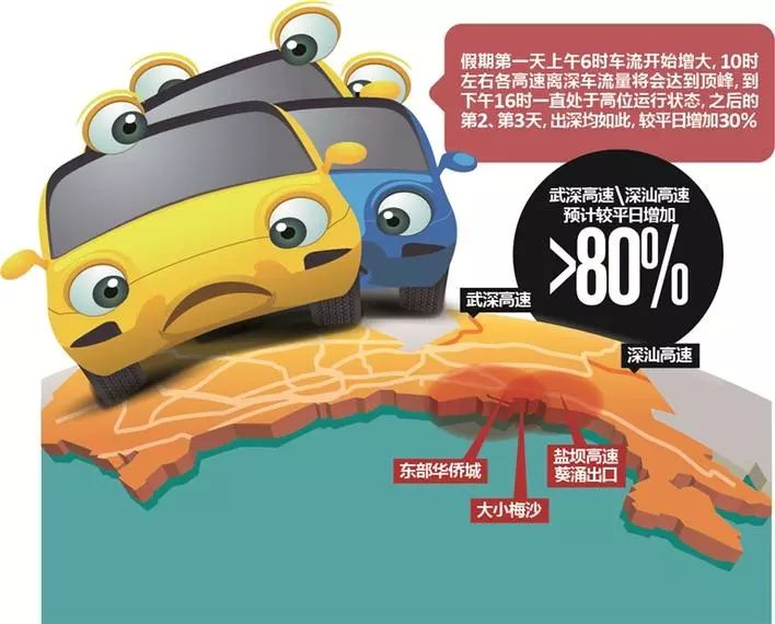 ⑩深圳交警預(yù)測全市從9月30日下午開始交通流量加大,9月30日、10月1日出行量達到頂峰。各高速公路、市內(nèi)各景點、商圈、購物點以及東部景區(qū)會出現(xiàn)不同程度的擁堵,全市各區(qū)羅湖區(qū)最為擁堵,其次是福田區(qū)、南山區(qū)。預(yù)計‘國慶’期間,全市出深和入深車輛總數(shù)均將超過170萬輛。