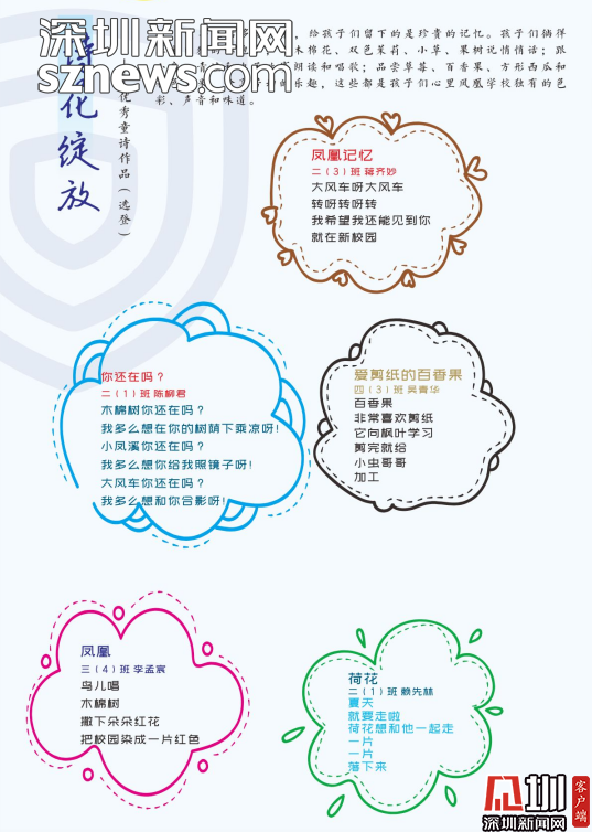 編委會(huì)的老師感慨,《童詩(shī)鳳凰》這本詩(shī)集是扎根于詩(shī)意校園的土壤結(jié)出的詩(shī)花。是鳳凰的孩子們?cè)诤商吝?、在草莓地、在蘑菇亭、在好玩的地方用心聆?tīng)大自然后,最真實(shí)最動(dòng)人的表達(dá)。