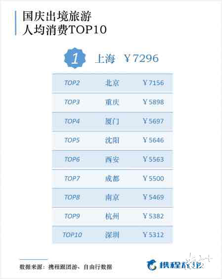 而國慶假期國人出境游花費(fèi)多少錢?據(jù)攜程出境游數(shù)據(jù)顯示,國慶通過攜程旅游平臺報名跟團(tuán)游、自由行、定制游等度假產(chǎn)品的人均花費(fèi)是國內(nèi)游價格的近2倍。出境游消費(fèi)力前十名出發(fā)城市為上海、北京、重慶、廈門、沈陽、西安、成都、南京、杭州和深圳。上海和北京出境游人均花費(fèi)超過了7000元,遠(yuǎn)遠(yuǎn)超過了其他城市。