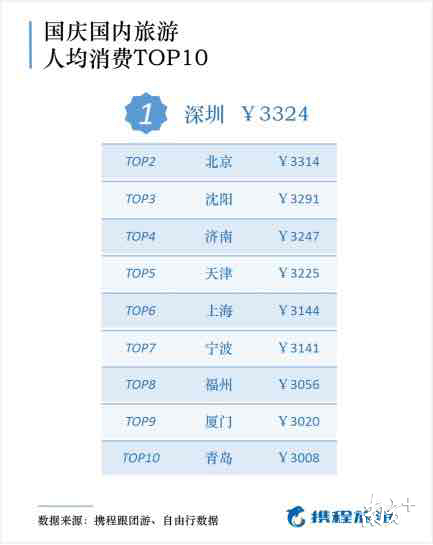 哪些城市居民的平均消費(fèi)最高?根據(jù)攜程跟團(tuán)游和自由行數(shù)據(jù),“國內(nèi)游消費(fèi)力前十強(qiáng)城市”依次為深圳、北京、沈陽、濟(jì)南、天津、上海、寧波、福州、廈門和青島。這些城市國慶旅游單次國內(nèi)游人均花費(fèi)超過3000元,其中深圳人最舍得花錢,單次國內(nèi)旅游人均花費(fèi)達(dá)到了3324元。