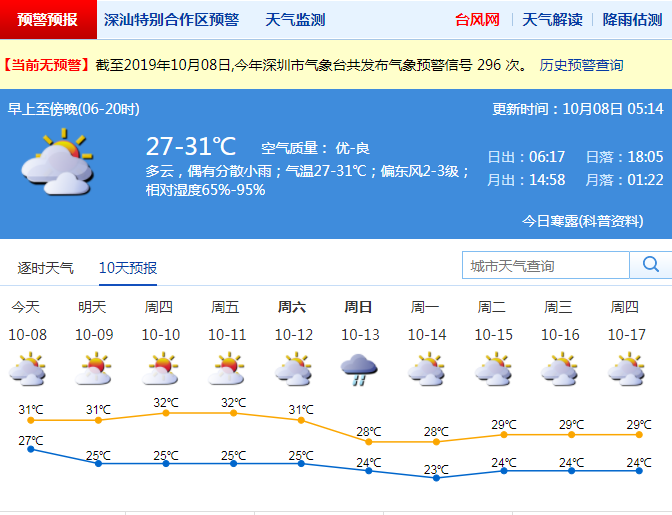 見圳客戶端·深圳新聞網(wǎng)2019年10月08日訊 據(jù)深圳市氣象局消息,今天深圳多云,偶有分散小雨;氣溫27-31℃;偏東風2-3級;相對濕度65%-95%。