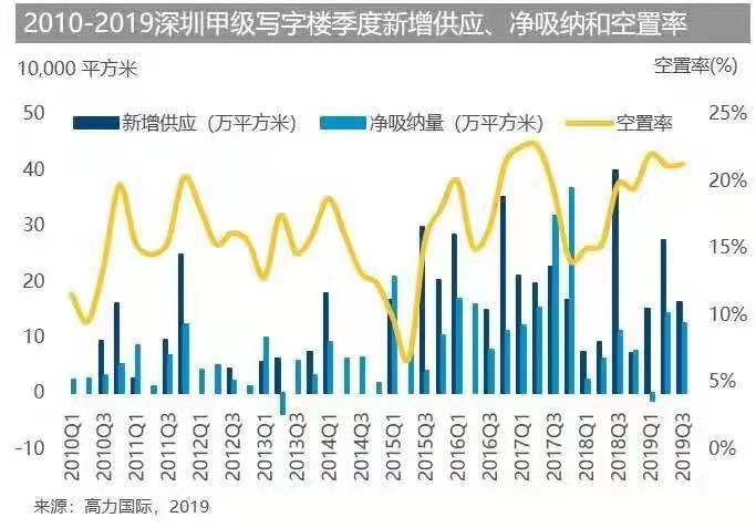 2019年第三季度,深圳甲級寫字樓市場保持較為健康和活躍的態(tài)勢,本季度內(nèi)市場凈吸納量表現(xiàn)良好,且新增供應(yīng)面積相比上一季度有所下降,空置率也穩(wěn)定在21.1%。但是,我們認(rèn)為空置率在第四季度會再次上升且持續(xù)到2020年,取決于計(jì)劃中的新增供應(yīng)完工入市情況。
