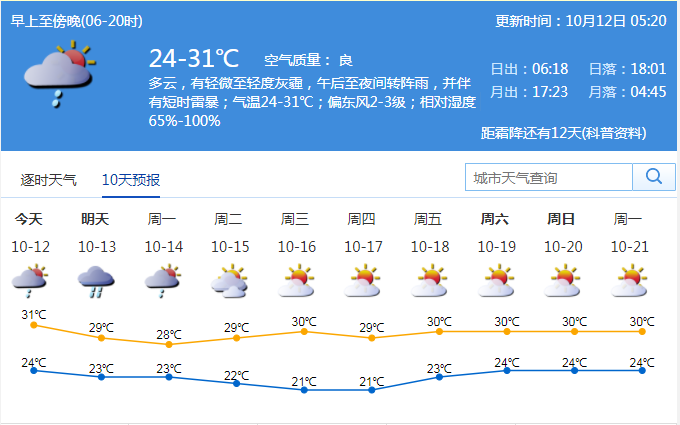 見圳客戶端·深圳新聞網(wǎng)2019年10月12日訊 據(jù)深圳市氣象臺消息,今日深圳多云,有輕微至輕度灰霾,午后至夜間轉(zhuǎn)陣雨,并伴有短時(shí)雷暴;氣溫24-31℃;偏東風(fēng)2-3級;相對濕度65%-100%