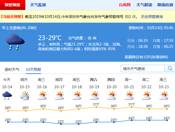 見圳客戶端·深圳新聞網(wǎng)2019年10月14日訊 受冷空氣影響,昨日凌晨至上午深圳普降大雨,局部暴雨,并伴有雷暴和7級左右短時(shí)大風(fēng)。預(yù)計(jì)本周前期風(fēng)力清勁有陣雨,中后期晴好干燥。其中,周一有陣雨,高地、沿海和海區(qū)陣風(fēng)6-7級,早晚較涼,氣溫23-29℃;周二漸轉(zhuǎn)多云,陣風(fēng)7-8級;周三至周日晴天干燥。