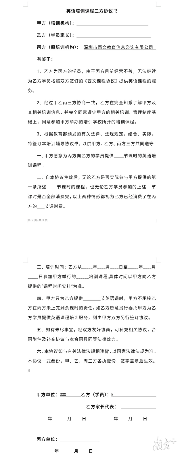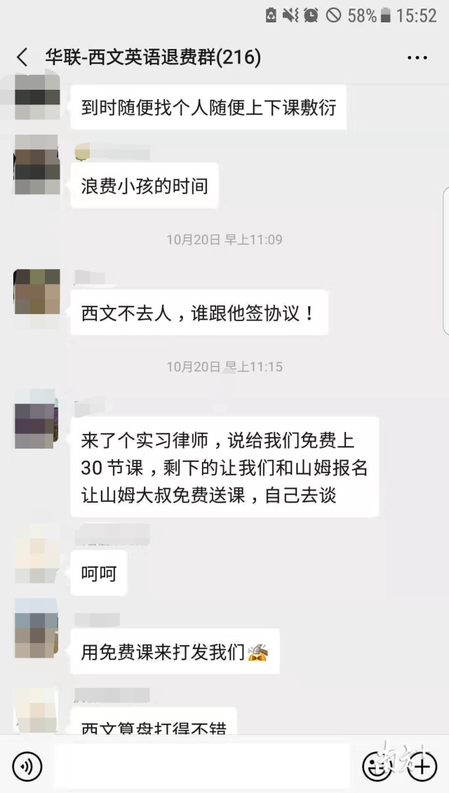 退費(fèi)群里的周女士介紹,10月20日,西文英語(yǔ)提供了一份“英語(yǔ)培訓(xùn)課程三方協(xié)議書(shū)”,但上面很多條款都沒(méi)有寫(xiě)清楚。西文英語(yǔ)委托的律師稱,山姆大叔少兒英語(yǔ)愿意給西文英語(yǔ)的學(xué)員免費(fèi)提供30節(jié)課程,但學(xué)員在西文英語(yǔ)其他剩余課時(shí)的解決方案,需自行和山姆大叔協(xié)商。