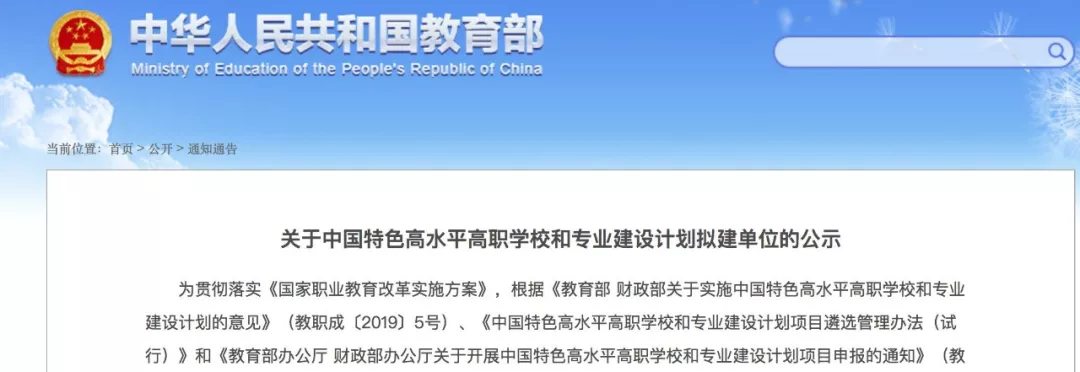2019年4月1日,教育部、財政部聯(lián)合印發(fā)《關(guān)于實(shí)施中國特色高水平高職學(xué)校和專業(yè)建設(shè)計劃的意見》,提出要集中力量建設(shè)50所左右高水平高職學(xué)校和150個左右高水平專業(yè)群,打造技術(shù)技能人才培養(yǎng)高地和技術(shù)技能創(chuàng)新服務(wù)平臺。