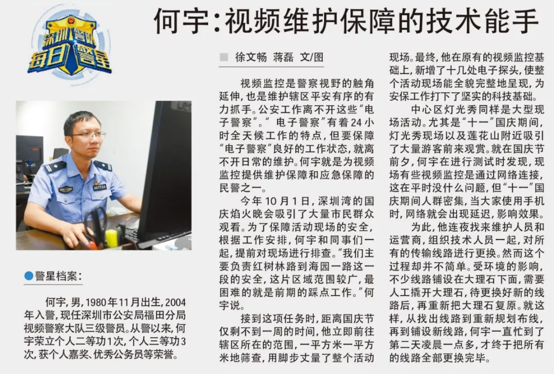 何宇,男,1980年11月出生,2004年入警,現(xiàn)任深圳市公安局福田分局視頻警察大隊三級警員。從警以來,何宇榮立個人二等功1次,個人三等功3次,獲個人嘉獎、優(yōu)秀公務員等榮譽。
