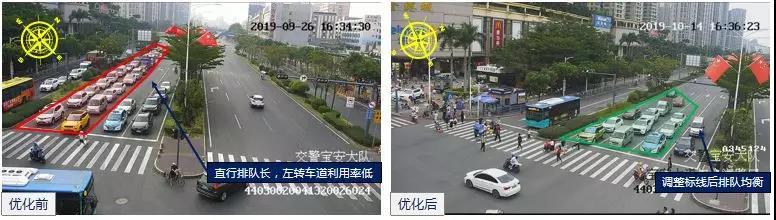 10月2日,針對車道劃分與交通需求不匹配的問題,調(diào)整北進(jìn)口車道劃分,由2左轉(zhuǎn)2直行調(diào)整為1左轉(zhuǎn)3直行,并調(diào)整路口紅綠燈方案,適當(dāng)增加北方向單放綠燈時(shí)間,降低南、北對直綠燈時(shí)間。優(yōu)化后,北方向通行效率提升明顯,晚高峰期間小時(shí)通過量由820pcu/h提高至980pcu/h,提升19.5%。