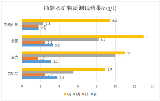 3款飲用天然礦泉水和1款飲用天然水中的礦物質(zhì)鉀、鈣、鈉、鎂是人體所需元素,均符合國家標(biāo)準(zhǔn)及產(chǎn)品標(biāo)簽明示指標(biāo)的要求,分別是農(nóng)夫山泉、景田、益力和娃哈哈。