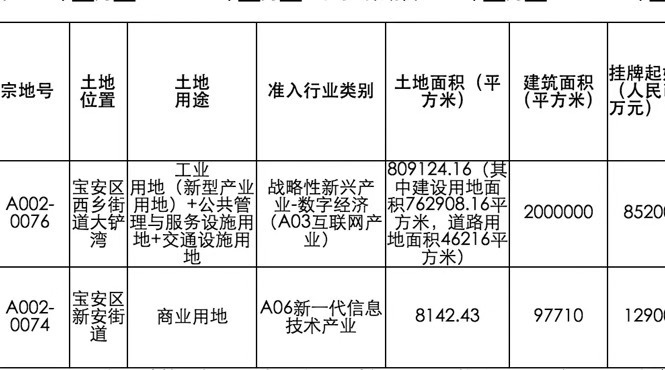 根據(jù)公告,深圳市土地房產(chǎn)交易中心受深圳市規(guī)劃和自然資源局寶安管理局委托,擬出讓寶安區(qū)西鄉(xiāng)街道大鏟灣A002-0076和寶安區(qū)新安街道A002-0074兩宗地。掛牌期自2019年11月20日至2019年11月29日15時(shí)止。(見圖表)