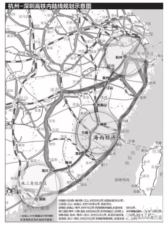 去年,參加全國兩會的部分全國人大代表提出一份《關于將杭深高鐵近海內陸線列入國家“十三五”現(xiàn)代綜合交通發(fā)展規(guī)劃修編和國家中長期鐵路網(wǎng)規(guī)劃的建議》。杭深高鐵近海內陸線擬自杭州西經(jīng)衢州西-江山-武夷山-南平-三明-龍巖-梅州-龍川至深圳,總長約1200公里。
