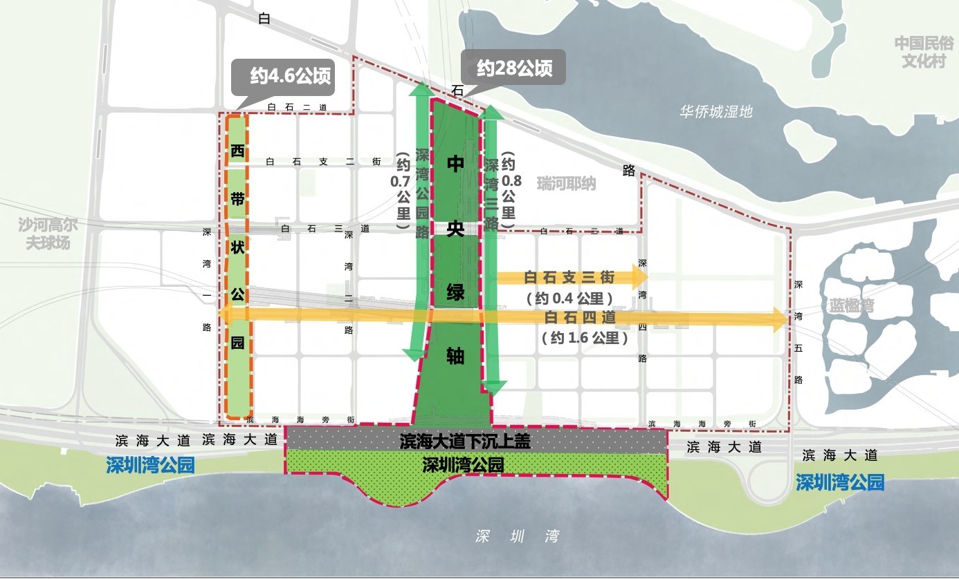 國(guó)際咨詢的重點(diǎn)設(shè)計(jì)范圍為中央綠軸(約28公頃,含濱海大道下沉上蓋和深圳灣公園部分區(qū)域)(含深灣公園路、深灣三路街道空間)、片區(qū)重要街道(白石四道、白石支三街)、西帶狀公園(約4.6公頃)等。