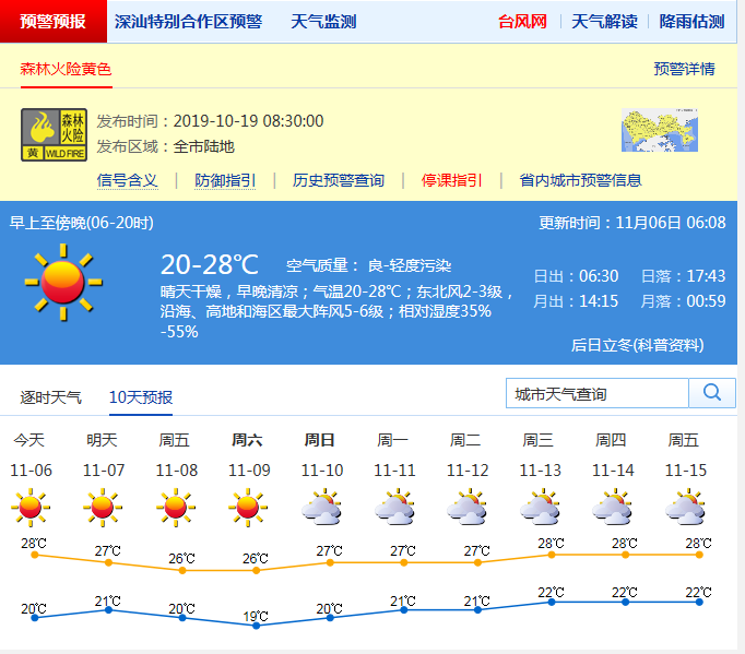 見圳客戶端·深圳新聞網2019年11月6日訊 近幾日,深圳天氣早晚清涼,持續(xù)干燥。據“深圳天氣”官方微博消息,今天(11月6日),深圳晴天干燥;氣溫20-28℃;東北風2-3級;相對濕度35%-55%。