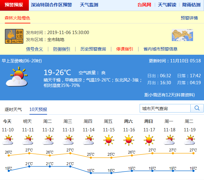 見圳客戶端·深圳新聞網(wǎng)2019年11月10日訊 深圳市氣象臺預(yù)計10-11日晴天間多云,空氣非常干燥,早晚清涼,10日氣溫19-26℃;12日云量增多,13-14日受冷空氣影響,北風(fēng)明顯加大,氣溫下降;15-17日晴天干燥,早晚清涼。