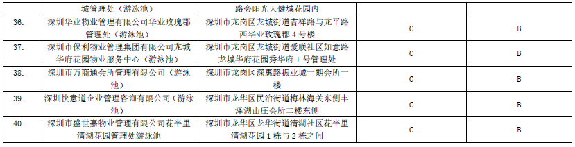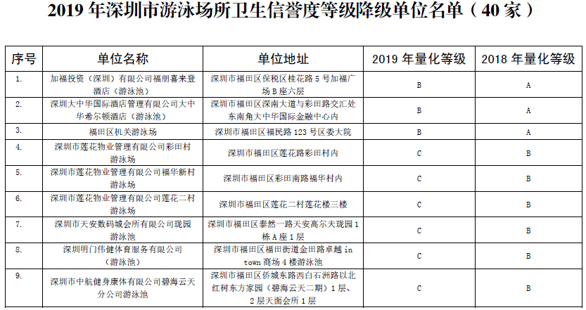 2019年深圳市游泳場(chǎng)所衛(wèi)生信譽(yù)度等級(jí)降級(jí)單位名單