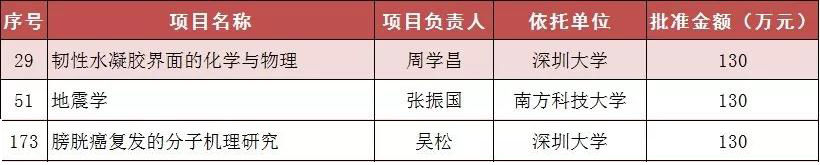 深圳大學2個,分別是:韌性水凝膠界面的化學與物理(項目負責人:周學昌);膀胱癌復發(fā)的分子機理研究(項目負責人:吳松);
