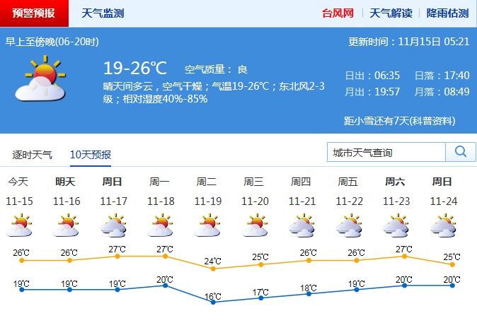 見圳客戶端·深圳新聞網(wǎng)2019年11月15日訊 記者從深圳市氣象臺了解到,15日晴天間多云,空氣干燥;氣溫19-26℃;東北風2-3級;濕度40%-80%。16-17日晴天間多云,早晚清涼,部分時間能見度較差。18-20日新一股冷空氣影響,北風明顯加大,氣溫下降。