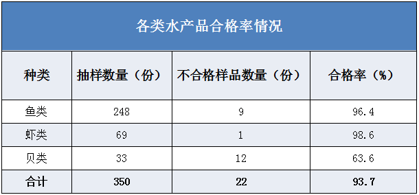 此外,水產(chǎn)品中魚類不合格樣品數(shù)量為9份;蝦類1份;貝類12份樣品不合格。