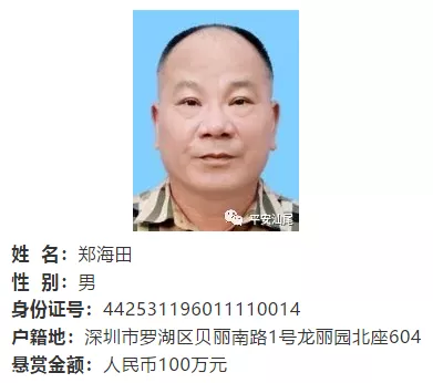 汕尾市公安局于11月11日發(fā)布的通告中,共有3人被懸賞通緝,分別是鄭海田(金額100萬(wàn))、唐偉杰(金額100萬(wàn))、洪水生(金額50萬(wàn))。