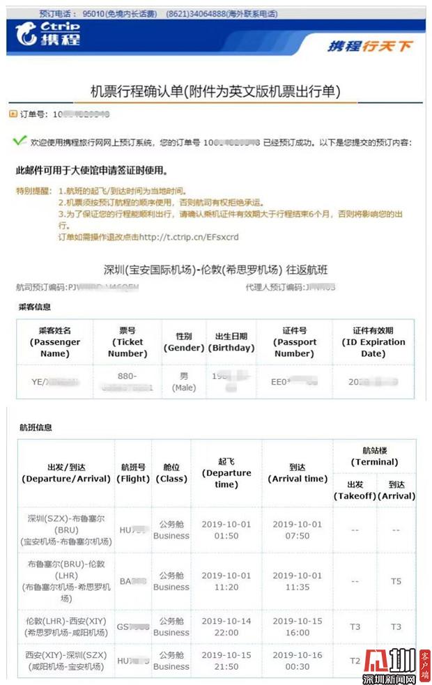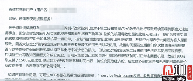 近日,葉先生向深圳新聞網(wǎng)記者爆料稱,他于今年8月份通過(guò)攜程網(wǎng)購(gòu)買(mǎi)國(guó)慶期間深圳往返倫敦的機(jī)票,但轉(zhuǎn)機(jī)時(shí)卻因查不到登機(jī)信息導(dǎo)致滯留機(jī)場(chǎng),又因航司規(guī)定被剝奪返程機(jī)票的使用權(quán)。事后,葉先生反復(fù)與平臺(tái)及航司溝通要求說(shuō)明事件原因并要求賠償,但目前事件尚未完全解決。