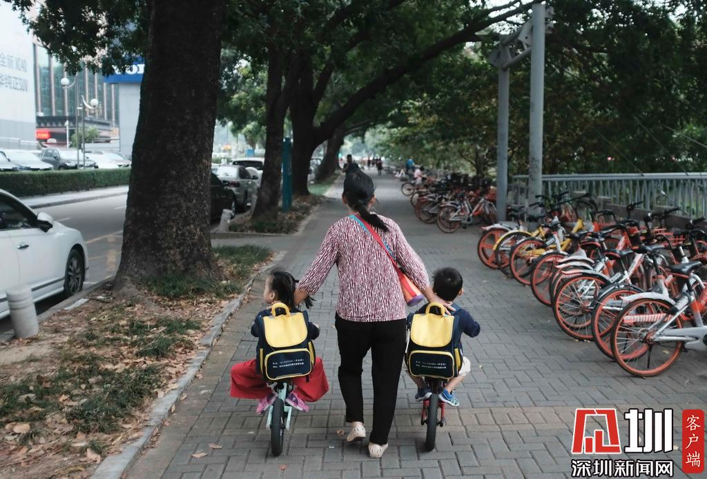 2019年10月28日,福田區(qū),放學(xué)路上,一位家長(zhǎng)帶著兩位小朋友。
