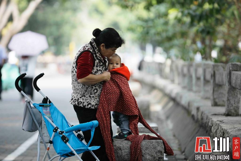 2019年11月19日,福田區(qū),冷空氣來襲,氣溫驟降,一位家長(zhǎng)為孩子添衣。