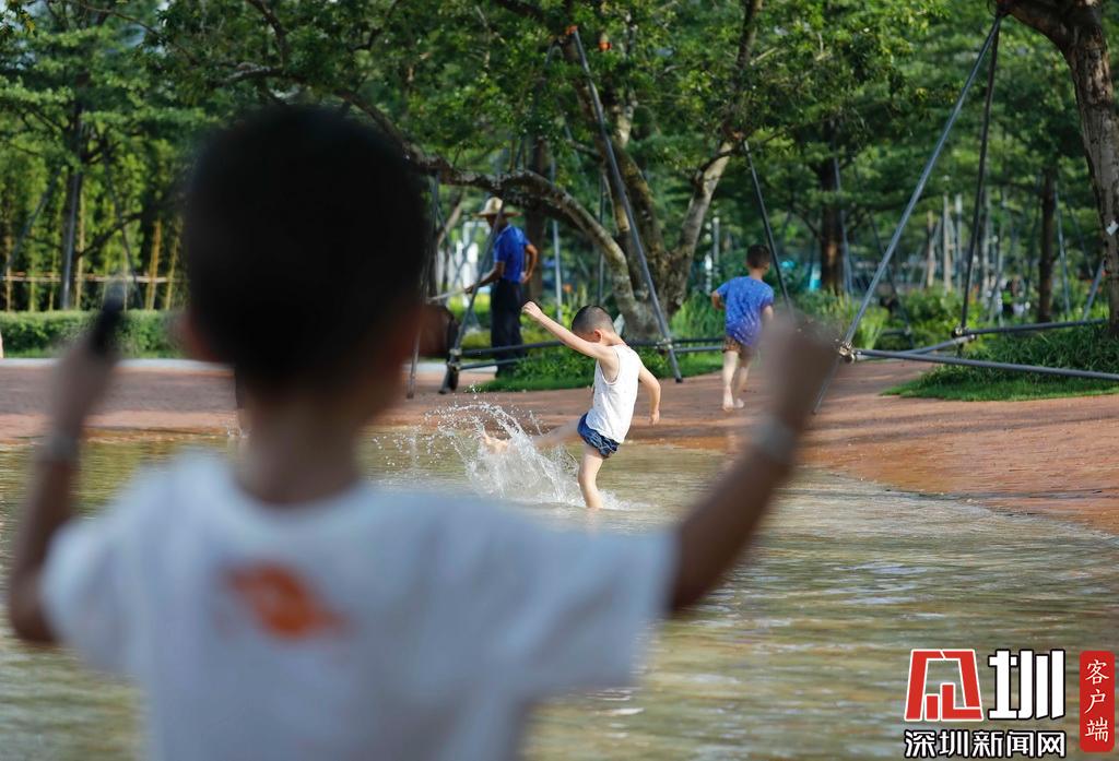 2019年8月23日,福田區(qū)中心書城。連日高溫后的一場(chǎng)降雨,一位小孩子在路邊的水坑玩水。