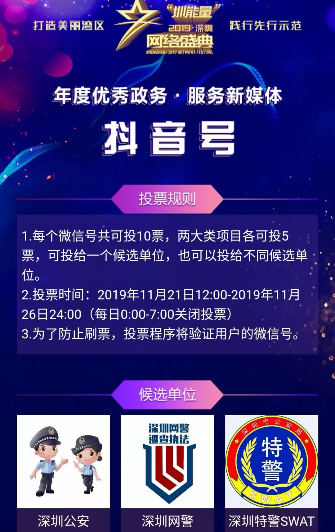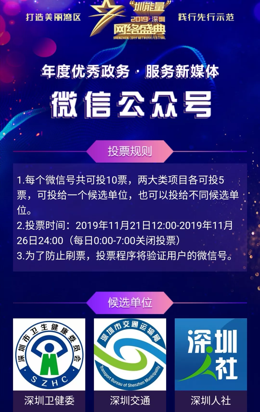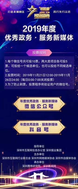 為盤點行業(yè)一年來取得的新探索、新成就、新經(jīng)驗,唱響主旋律,弘揚正能量,“‘圳能量’2019深圳網(wǎng)絡盛典”——暨深圳年度優(yōu)秀政務·服務新媒體活動將于2019年12月6日隆重舉行。