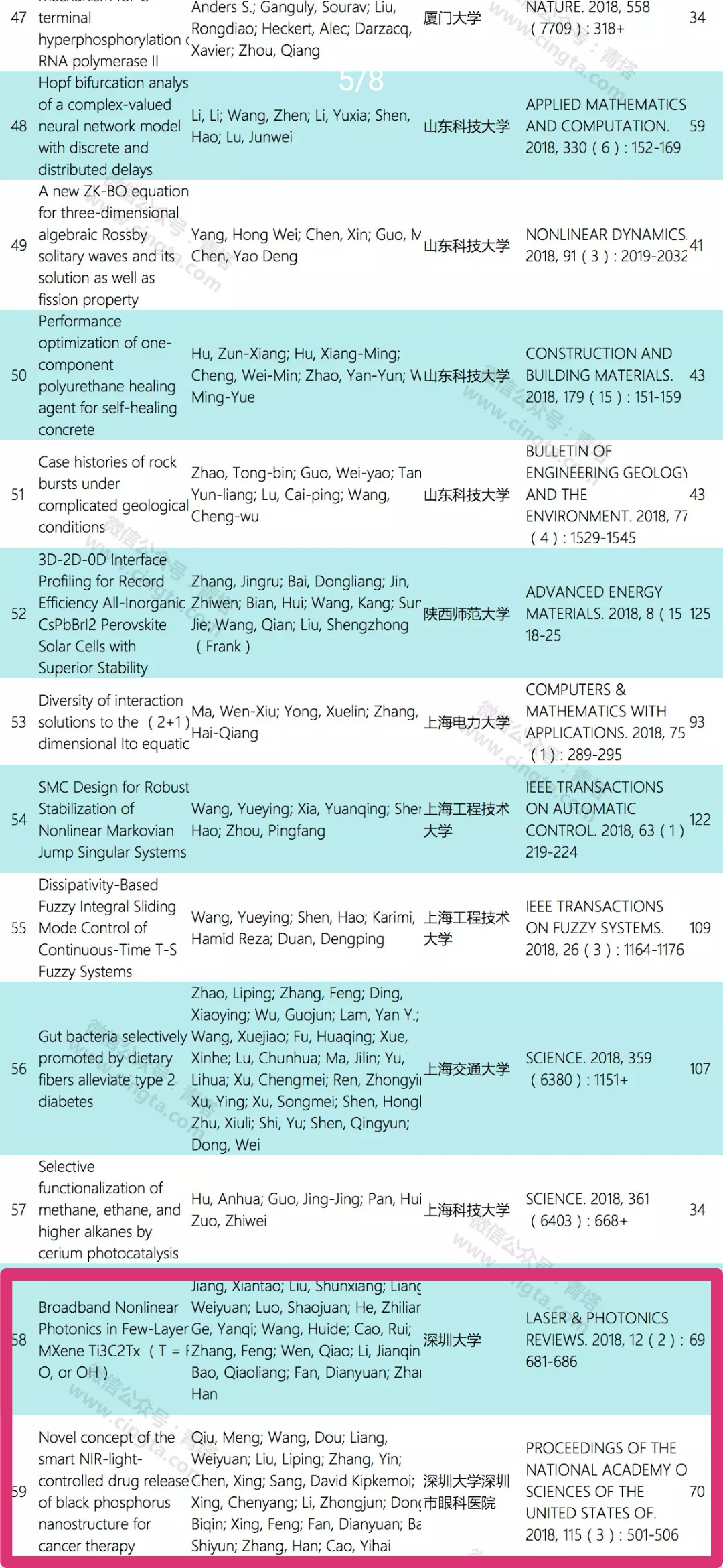 張晗教授課題組入選的2篇論文分別為《Broadband Nonlinear Photonics in Few-Layer MXene Ti3C2Tx (T = F, O, or OH)(新型智能近紅外光控黑磷納米結(jié)構(gòu)釋藥系統(tǒng)用于癌癥治療)》,所屬機(jī)構(gòu)為深圳大學(xué),來源期刊為《LASER & PHOTONICS REVIEWS.2018,12(2):681-686(美國科學(xué)院院刊)》,被引次數(shù)69;《Novel concept of the smart NIR-light-controlled drug release of black phosphorus nanostructure for cancer therapy(少層MXene納米片中的非線性光子學(xué))》,所屬機(jī)構(gòu)為深圳大學(xué)深圳市眼科醫(yī)院,來源期刊為《PROCEEDINGS OF THE NATIONAL ACADEMY OF SCIENCES OF THE UNITED STATES OF.2018,115(3):501-506(激光光子學(xué)評(píng)論)》,被引次數(shù)70。