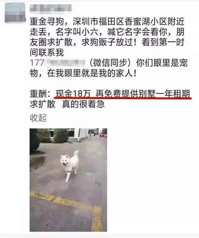 近日,深圳有位狗主人在朋友圈尋狗,重酬的內(nèi)容是:現(xiàn)金18萬+一年別墅使用權