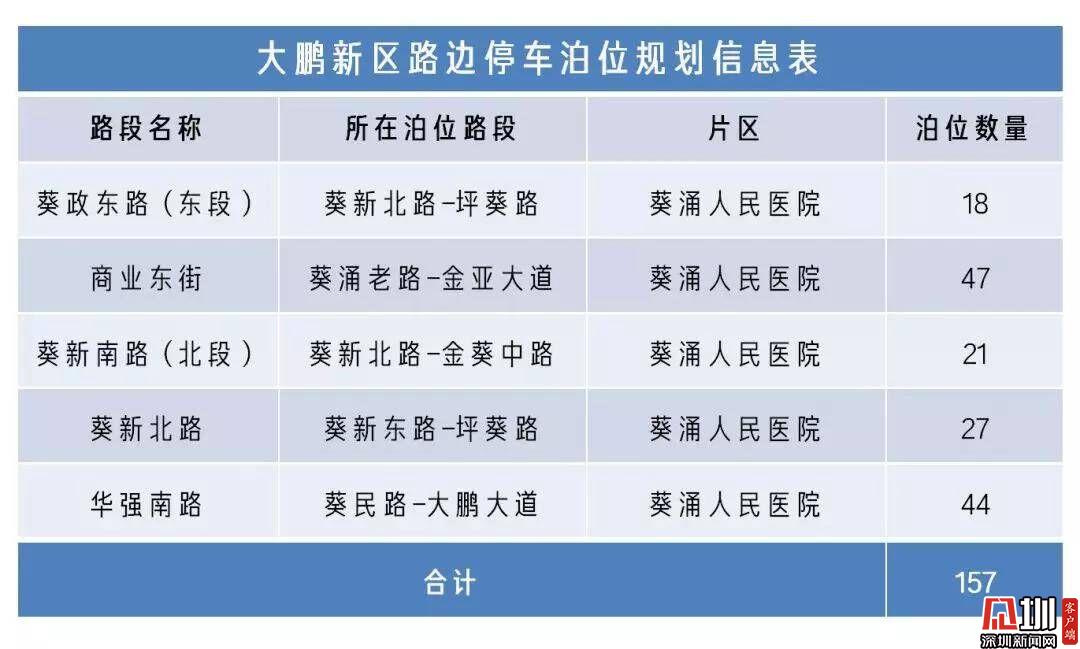 大鵬新區(qū)路邊宜停車位規(guī)劃信息表。