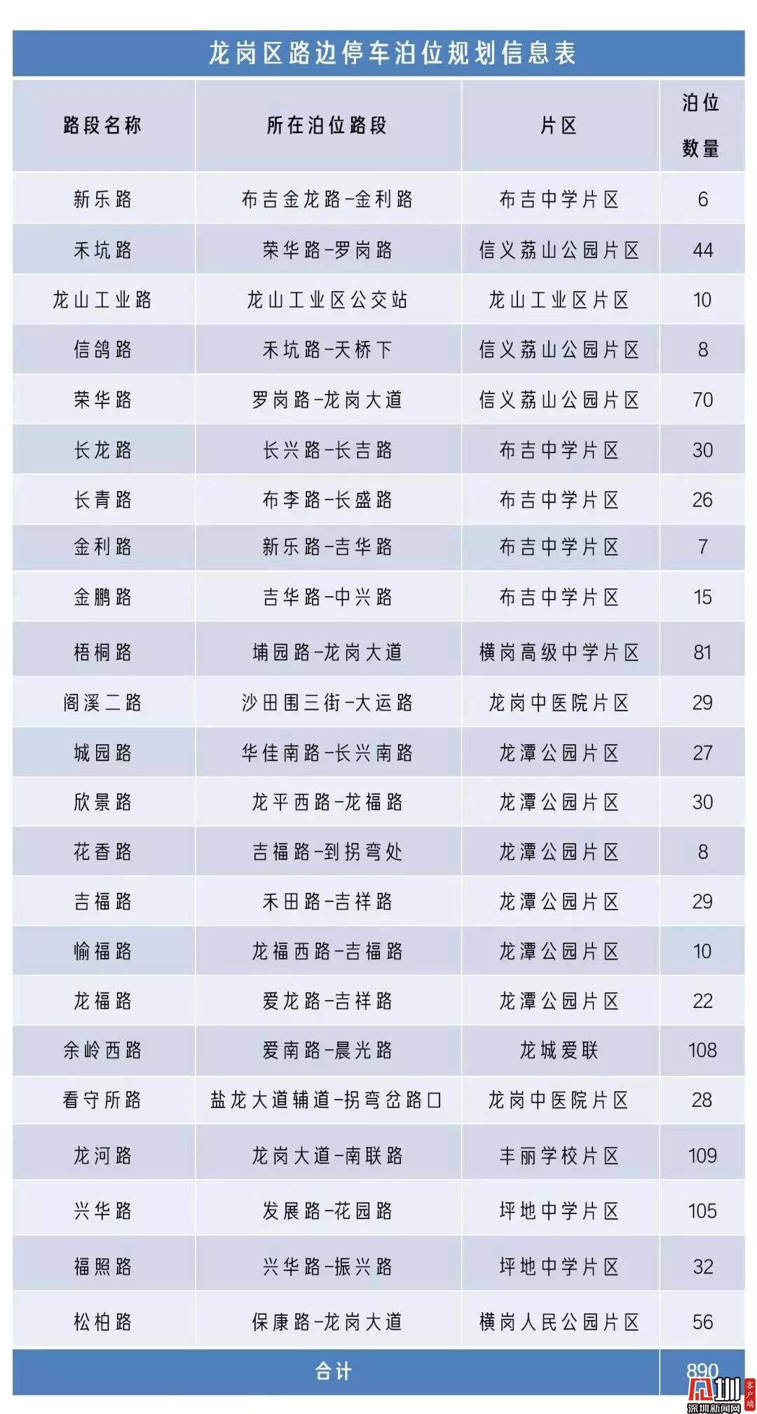 龍華區(qū)路邊宜停車位規(guī)劃信息表。