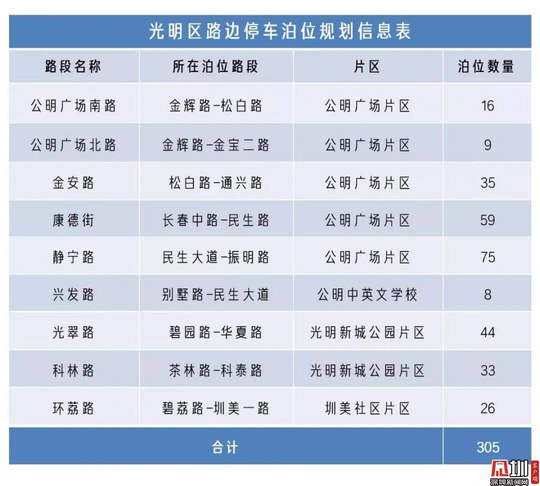 光明區(qū)路邊宜停車位規(guī)劃信息表。