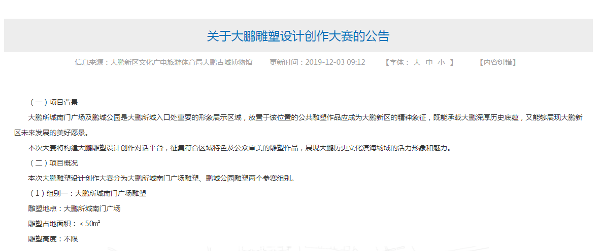 見圳客戶端·深圳新聞網(wǎng)2019年12月3日訊 為了展現(xiàn)大鵬歷史文化濱海場域的活力形象和魅力,12月3日,大鵬新區(qū)文化廣電旅游體育局大鵬古城博物館啟動(dòng)大鵬雕塑設(shè)計(jì)創(chuàng)作大賽,征集大鵬所城南門廣場及鵬城公園雕塑作品,參賽不限單位或個(gè)人,最終每組作品都將評選出6名獲獎(jiǎng)?wù)撸瑔雾?xiàng)最高獲4萬元獎(jiǎng)金,總獎(jiǎng)金22萬元。