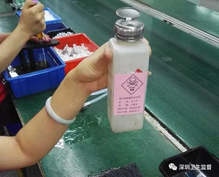 檢查過(guò)程中發(fā)現(xiàn)該公司A棟2樓水箱車間,可見組裝線組裝崗位工人韋某正在使用白電油(成分顯示為正己烷)作業(yè),未見佩戴防護(hù)指套。