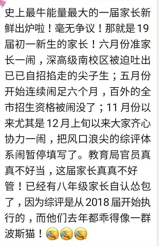 在家長的各種吐槽之下,12月11日,教育局召開了座談會:決定暫停2019年深圳市初中學生綜合素質評價填報工作。