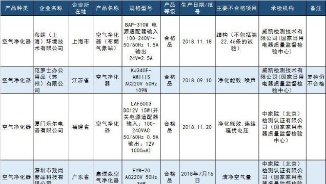 其中,深圳市艾吉森環(huán)??萍加邢薰旧a(chǎn)的空氣凈化器復(fù)檢仍不合格。