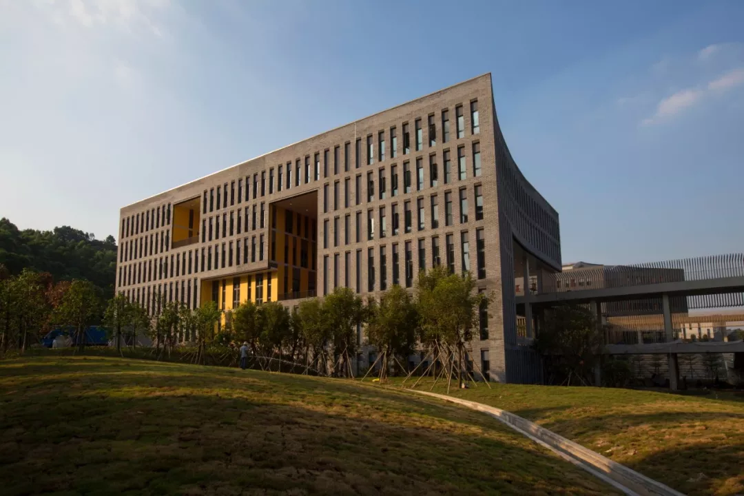 校園建筑群落依山就勢,外立面以“白墻”“格柵”為設計主要素,觀之簡潔舒展;公共空間流暢連續(xù),與自然環(huán)境融為一體。