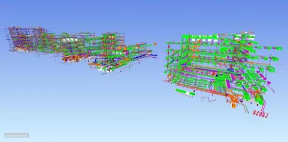 在施工準備階段,優(yōu)化原設計圖紙,提前解決施工階段遇到的問題,實現BIM深化圖指導現場施工放樣及管道安裝,滿足規(guī)范及空間使用要求;施工實施階段,基于BIM深化模型輸出工程量清單,輔助材料管理人員物資采購管理,支架深化及輸出加工圖,推進項目精細化管理。