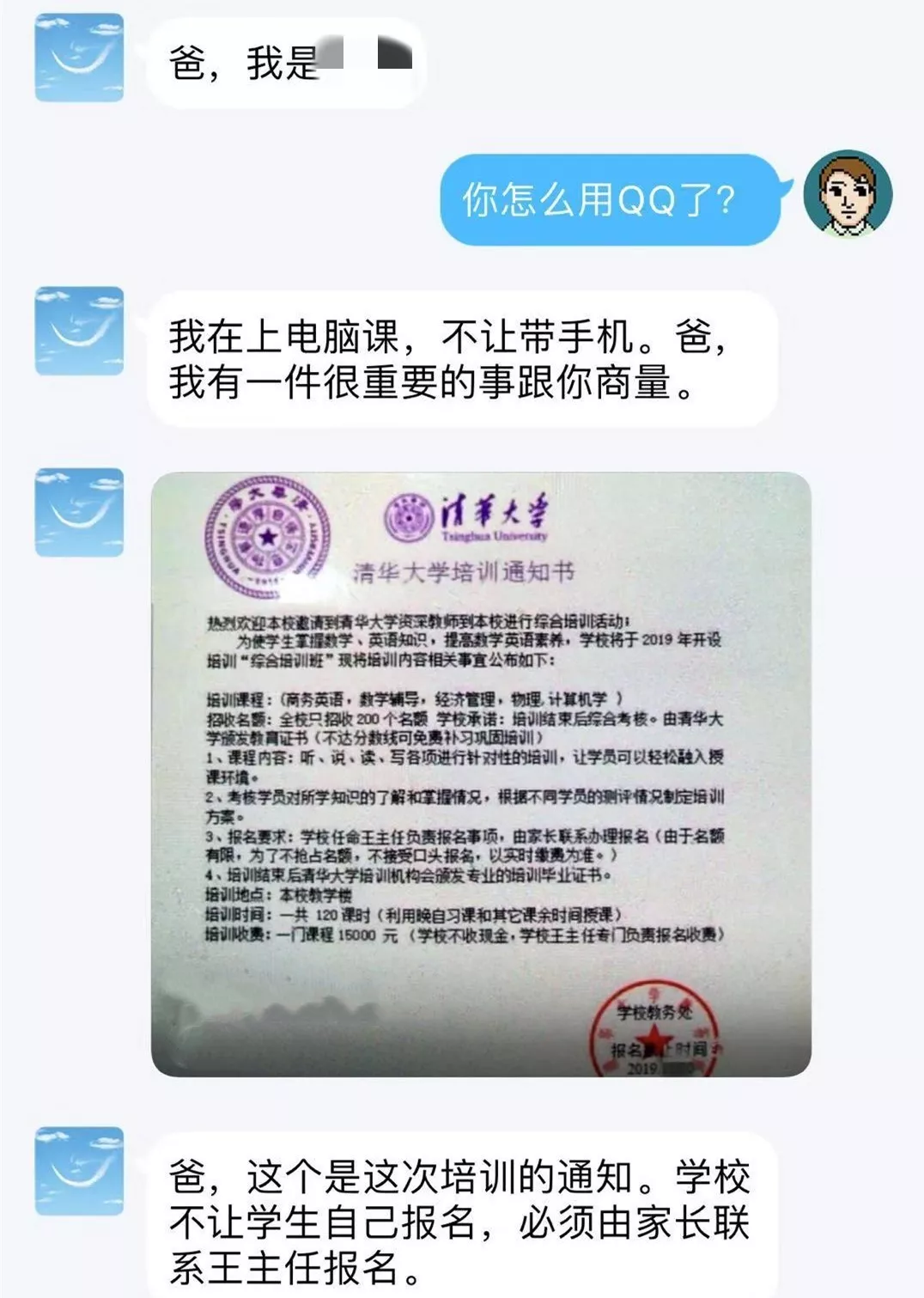 而他有一件重要的事情要與家長商量。接著發(fā)來了一張《清華大學(xué)培訓(xùn)通知書》。