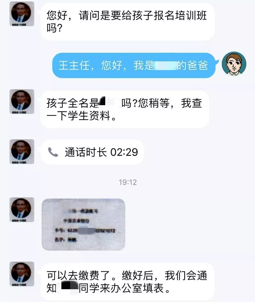 小陳也讓爸爸放心,這個(gè)錢不是打給他的,而是由家長直接繳費(fèi)給“王老師”。隨后給了“王老師”的工作QQ。