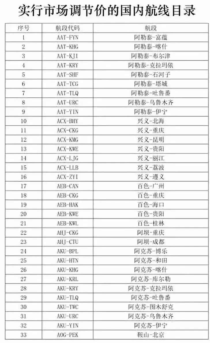 民航局最新《實(shí)行市場(chǎng)調(diào)節(jié)價(jià)的國內(nèi)航線目錄》部分截圖