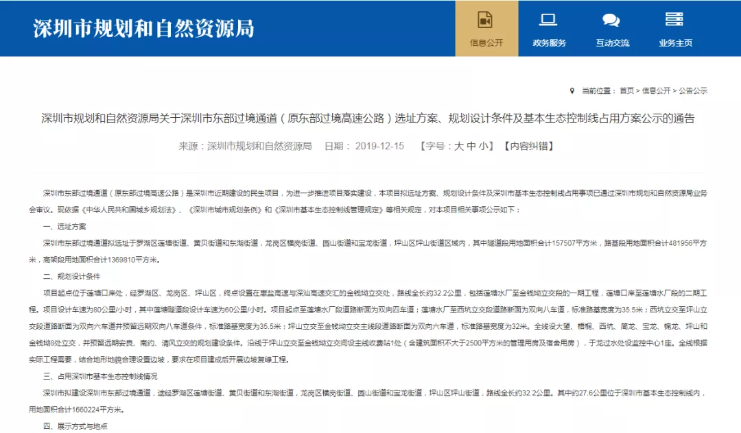 近日,深圳市規(guī)劃和自然資源局公示東部過境通道選址方案、規(guī)劃設(shè)計(jì)條件及基本生態(tài)控制線占用方案的通告,于2020年1月13日前向社會(huì)征求意見。