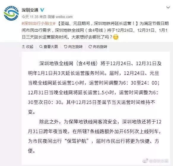 這里還要給大家插播一條交通消息。小編掐指一算,2019年馬上就要結(jié)束了,各位小伙伴是不是都開始,為新年假期做準(zhǔn)備了呢?這么重要的出去浪的機(jī)會(huì),怎能為趕不上末班地鐵煩惱?不要緊,地鐵也延長運(yùn)營時(shí)間啦。