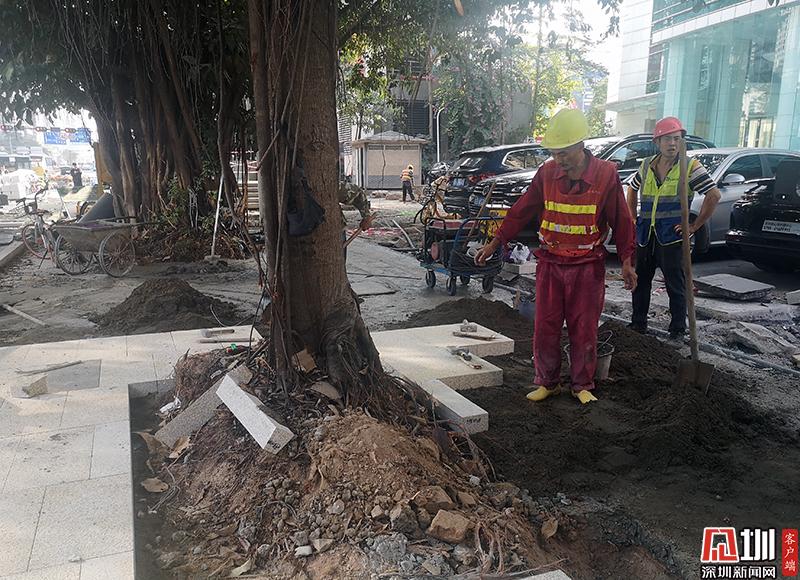 上午10點(diǎn),深圳市交通運(yùn)輸局執(zhí)法人員來(lái)到福田區(qū)民田路與福華路路口的一處施工現(xiàn)場(chǎng)。記者在現(xiàn)場(chǎng)看到,沿著福華路一側(cè)的人行道基本全部被挖開(kāi),建筑工人正在進(jìn)行人行道石磚的鋪設(shè)工作,由于施工圍擋布置不規(guī)范,現(xiàn)場(chǎng)也沒(méi)有完善的路線指引,不少市民出行受阻。