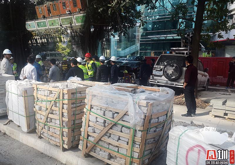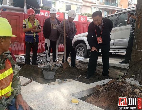 上午10點(diǎn),深圳市交通運(yùn)輸局執(zhí)法人員來(lái)到福田區(qū)民田路與福華路路口的一處施工現(xiàn)場(chǎng)。記者在現(xiàn)場(chǎng)看到,沿著福華路一側(cè)的人行道基本全部被挖開,建筑工人正在進(jìn)行人行道石磚的鋪設(shè)工作,由于施工圍擋布置不規(guī)范,現(xiàn)場(chǎng)也沒(méi)有完善的路線指引,不少市民出行受阻。