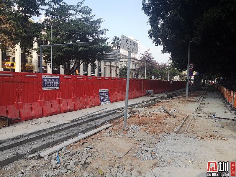 在福中三路和民田路交叉口的施工現(xiàn)場(chǎng),民田路一側(cè)的人行道幾乎被全部“扒開”。