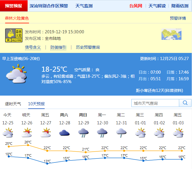 見圳客戶端·深圳新聞網(wǎng)2019年12月25日訊 25-26日多云間晴天,有輕霧或霾;26日夜間至27日冷空氣影響,風力加大,沿海、高地和海區(qū)最大陣風7級左右,氣溫下降,天氣轉(zhuǎn)涼,最低氣溫14℃;28日夜間-31日轉(zhuǎn)陰雨天氣。
