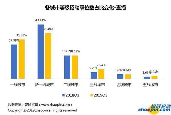 從趨勢上看,短視頻機(jī)構(gòu)隨著用戶的下沉也在下沉,而直播領(lǐng)域呈現(xiàn)進(jìn)一步向一線城市聚集的趨勢。2019年三季度,短視頻行業(yè)在一線城市的招聘需求占比較去年同期下降了7.21個百分點,新一線、二線、三線等比例均有提高;直播行業(yè)在一線城市的招聘需求占比則是提高了4個百分點。(記者 莊瑞玉)